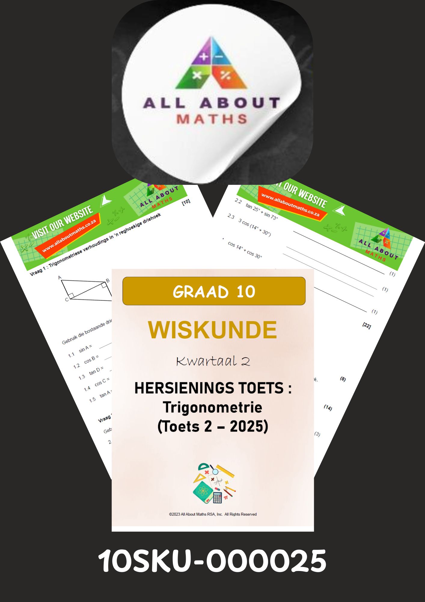 Die Graad 10 Kwartaal 2 Trigonometrie Hersieningstoets 2 is kundig ontwerp om leerders te help om kerntrigonometriese konsepte te bemeester β met fokus op driehoekoplossings met en sonder ‘n sakrekenaar.