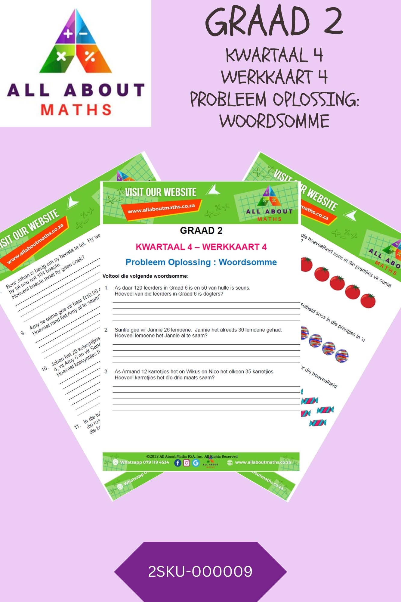 Hierdie werkkaart fokus op 20 woordsomme, waarvan sommige grafies voorgestel word met prente.