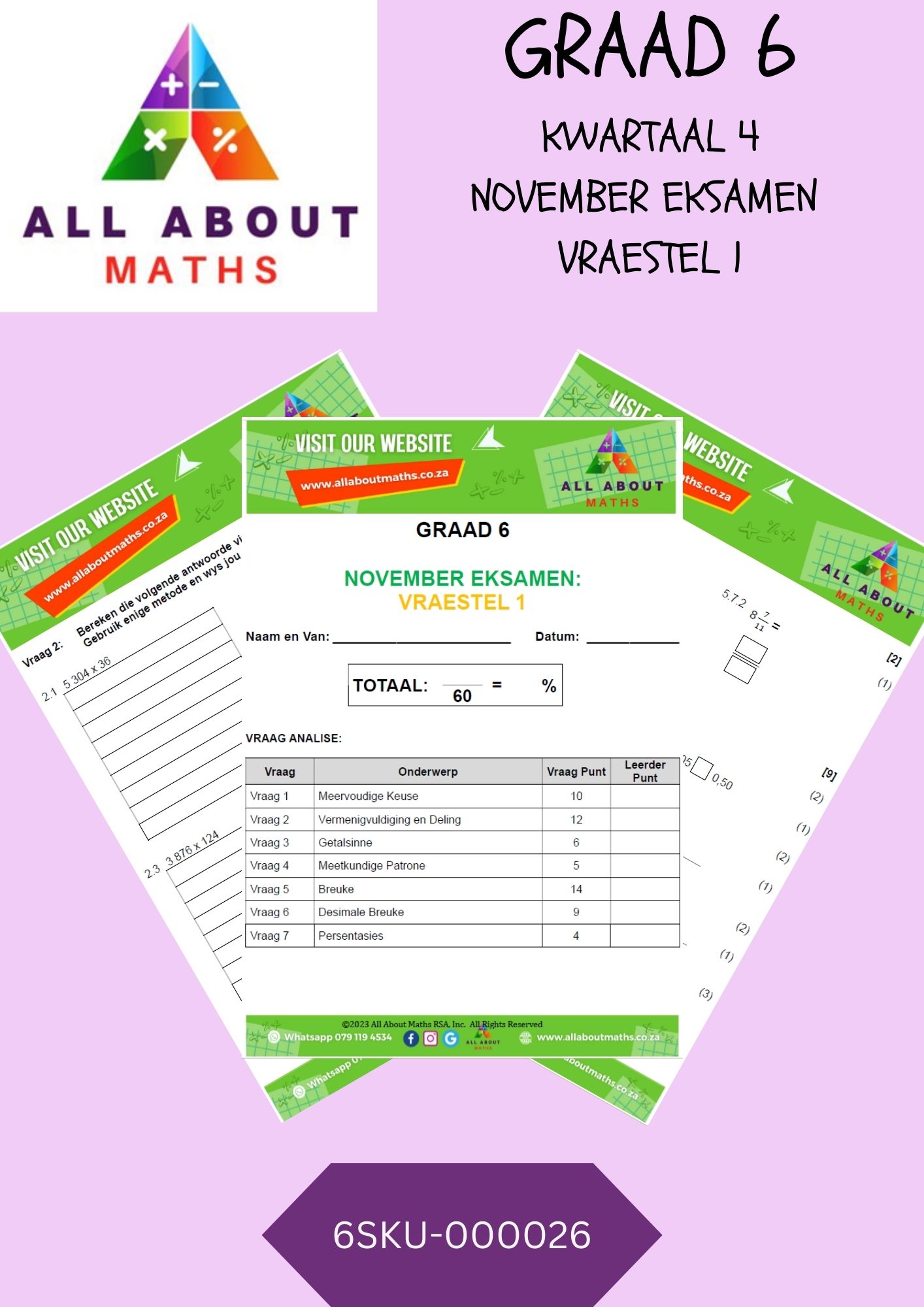 Hierdie omvattende hersieningstoets is spesifiek ontwerp vir Graad 6-leerders en dek ‘n wye verskeidenheid wiskundige onderwerpe wat leerders se begrip van basiese en intermediêre konsepte in wiskunde toets.