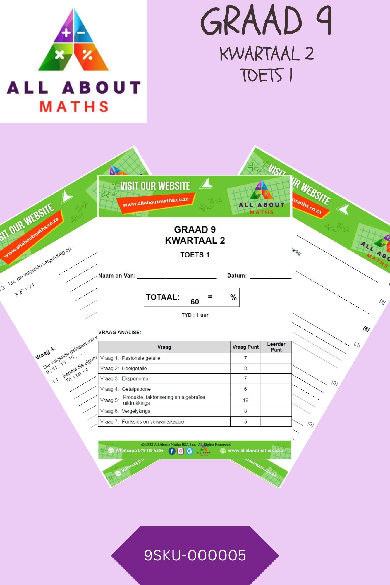 Hierdie toets is ideaal vir leerders wat hul kennis en begrip van die Graad 9 wiskunde-inhoud wil toets en verbeter. (Sluit Memorandum in)