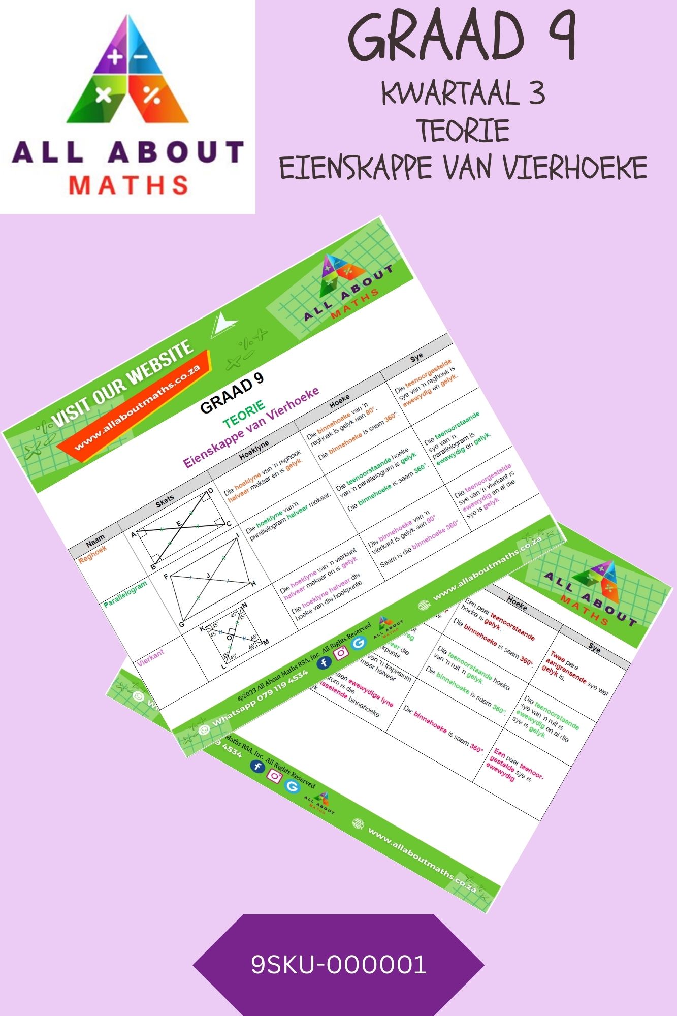 Die “Graad 9 – Teorie – Eienskappe van Vierhoeke” is ‘n studiemateriaal wat die kenmerke en eienskappe van verskillende vierhoeke beskryf.