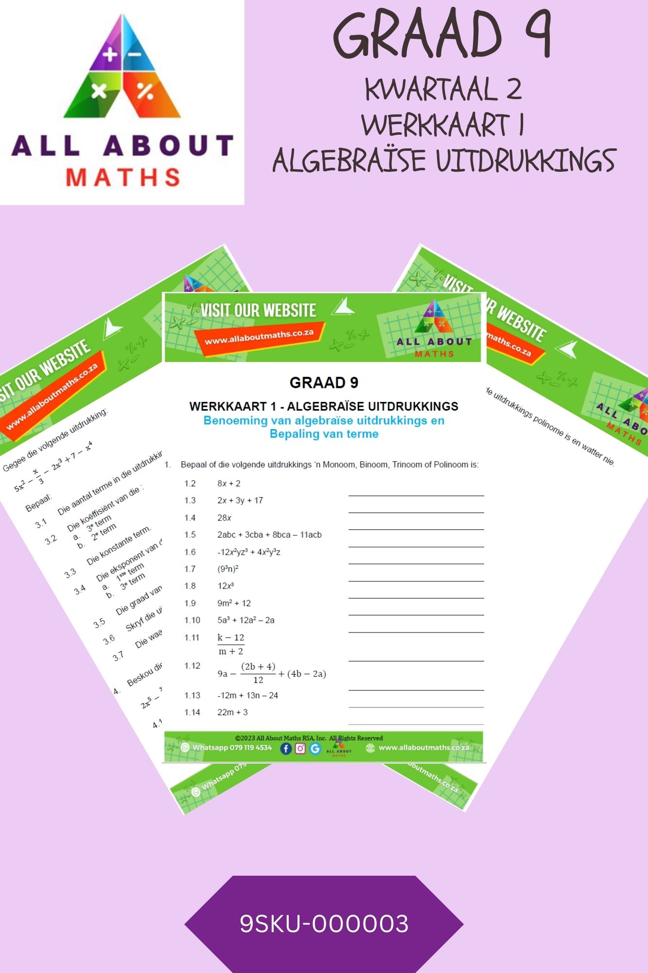 Die Graad 9 – Werkkaart 1 – Benoeming van Algebraïse Uitdrukkings en Bepaling van Terme is ‘n uitgebreide werkkaart wat Graad 9-leerders se begrip van algebraïse uitdrukkings toets.