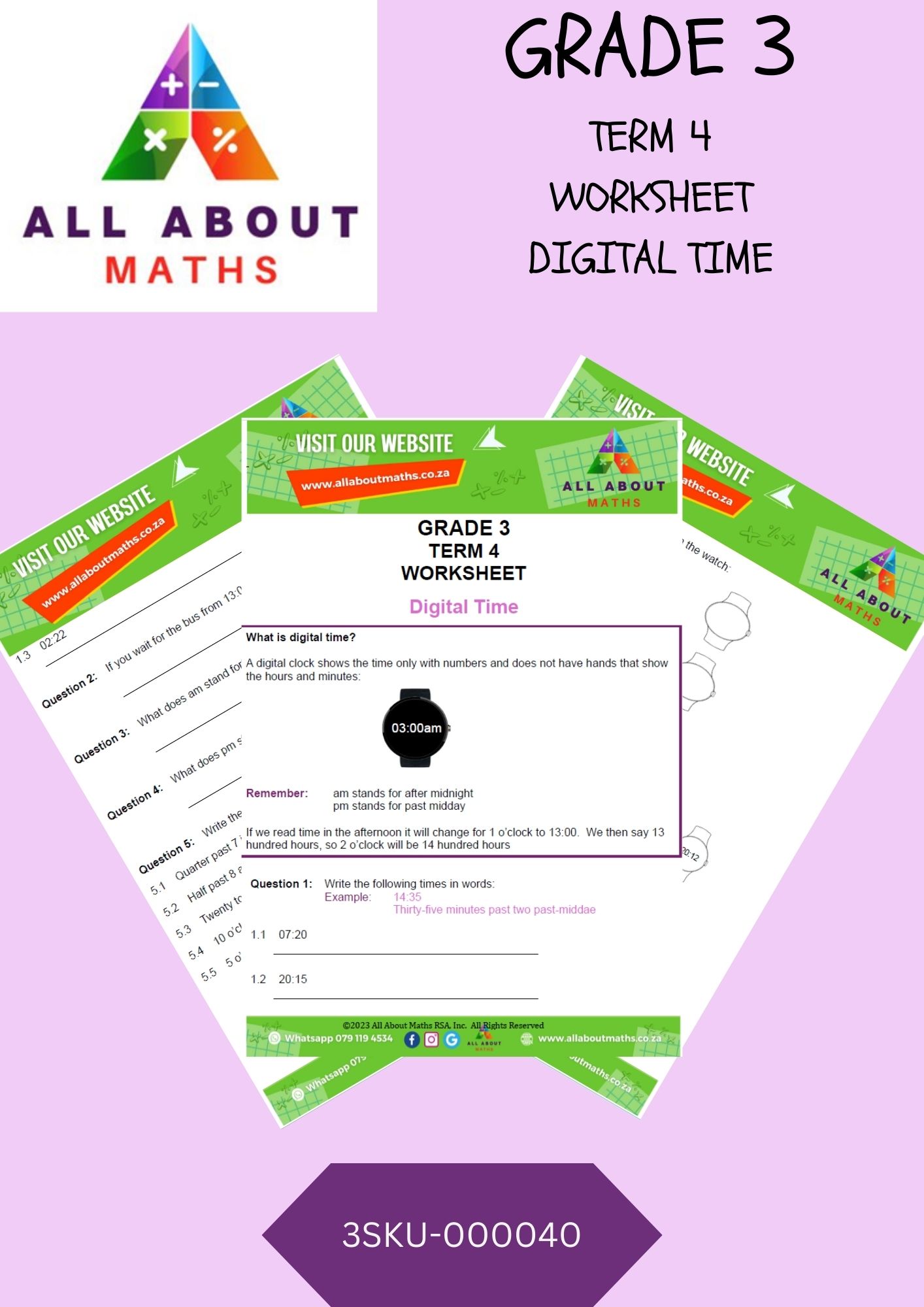 The product is a worksheet for Grade 3 students that focuses on the concept of digital time. The worksheet explains what digital time is by highlighting that a digital clock displays time using numbers, without hands. It includes exercises such as: